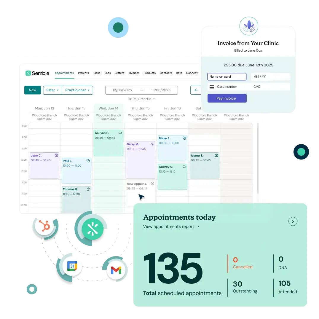 Semble makes the everyday easy, so your team can book, bill and report with ease while chasing less. Run your day-to-day operations in one place, with clinical confidence.