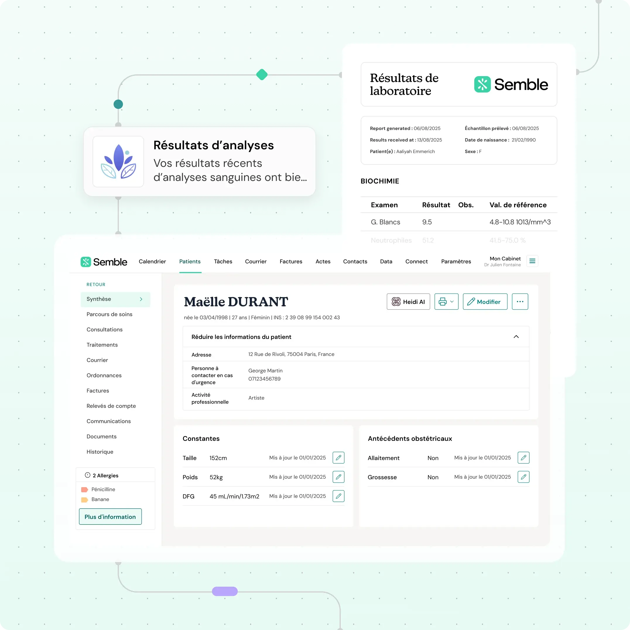 Médecins, infirmiers, sages-femmes et psychologues travaillent tous sur le même dossier patient dans Semble. Consultez l’historique complet du patient sans la ribambelle de papiers ou le souci des doubles saisies. Une meilleure coordination se traduit par de meilleurs résultats, moins d’erreurs et des parcours de soins plus viables.