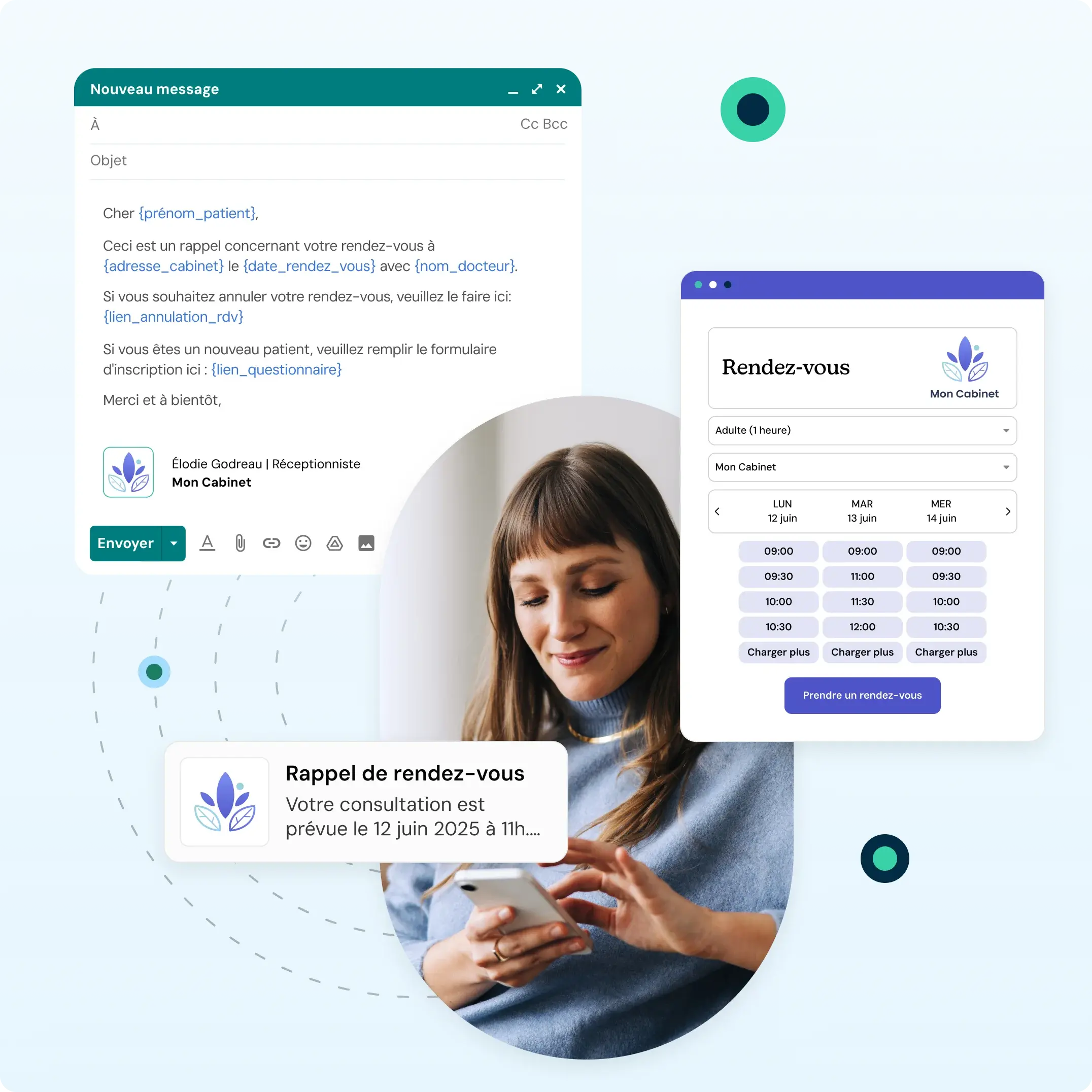 Automatisez des tâches comme les rappels de rendez-vous, les messages de suivi et les notifications de résultat d’examen sans développer d’intégration sur mesure.