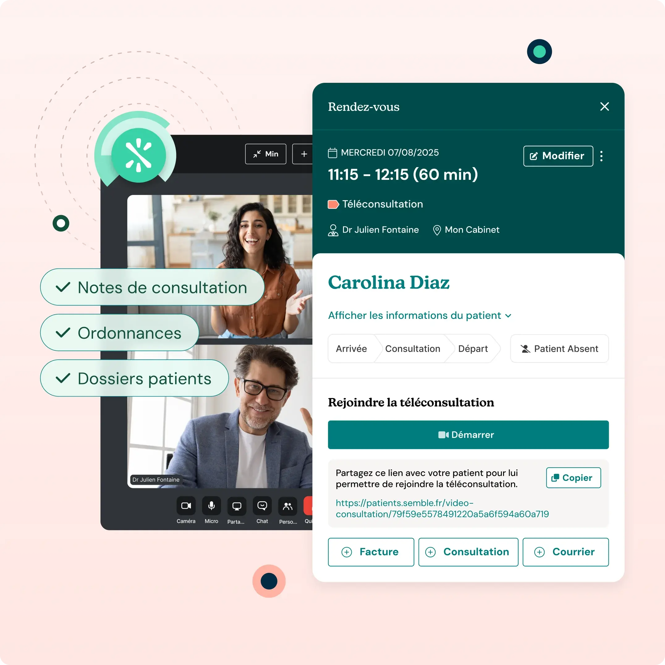 Lancez des téléconsultations à vos couleurs et parfaitement intégrées au reste du parcours patient. De l’admission à la consultation puis au suivi, Semble fait tourner la machine pour que vous ayez le contrôle de l’expérience.