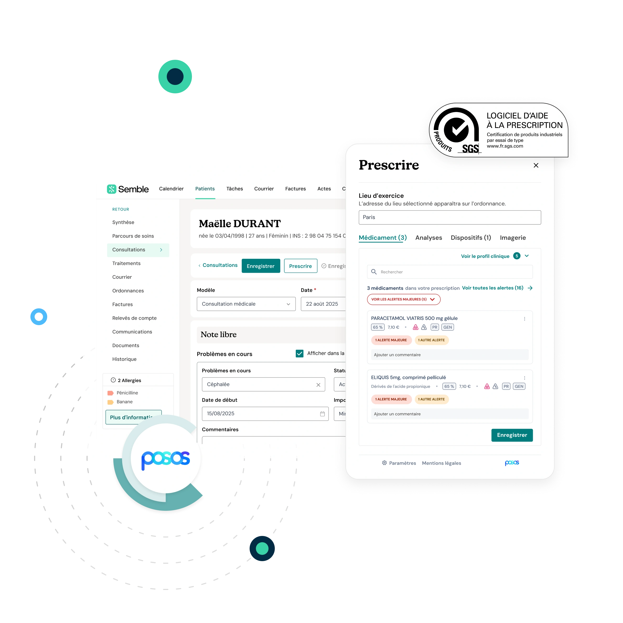 Semble intègre Posos, LAP certifié HAS V2, pour des prescriptions sécurisées avec aide à la décision médicamenteuse, alertes d'interactions et posologies adaptées. Créez des ordonnances conformes en quelques clics.