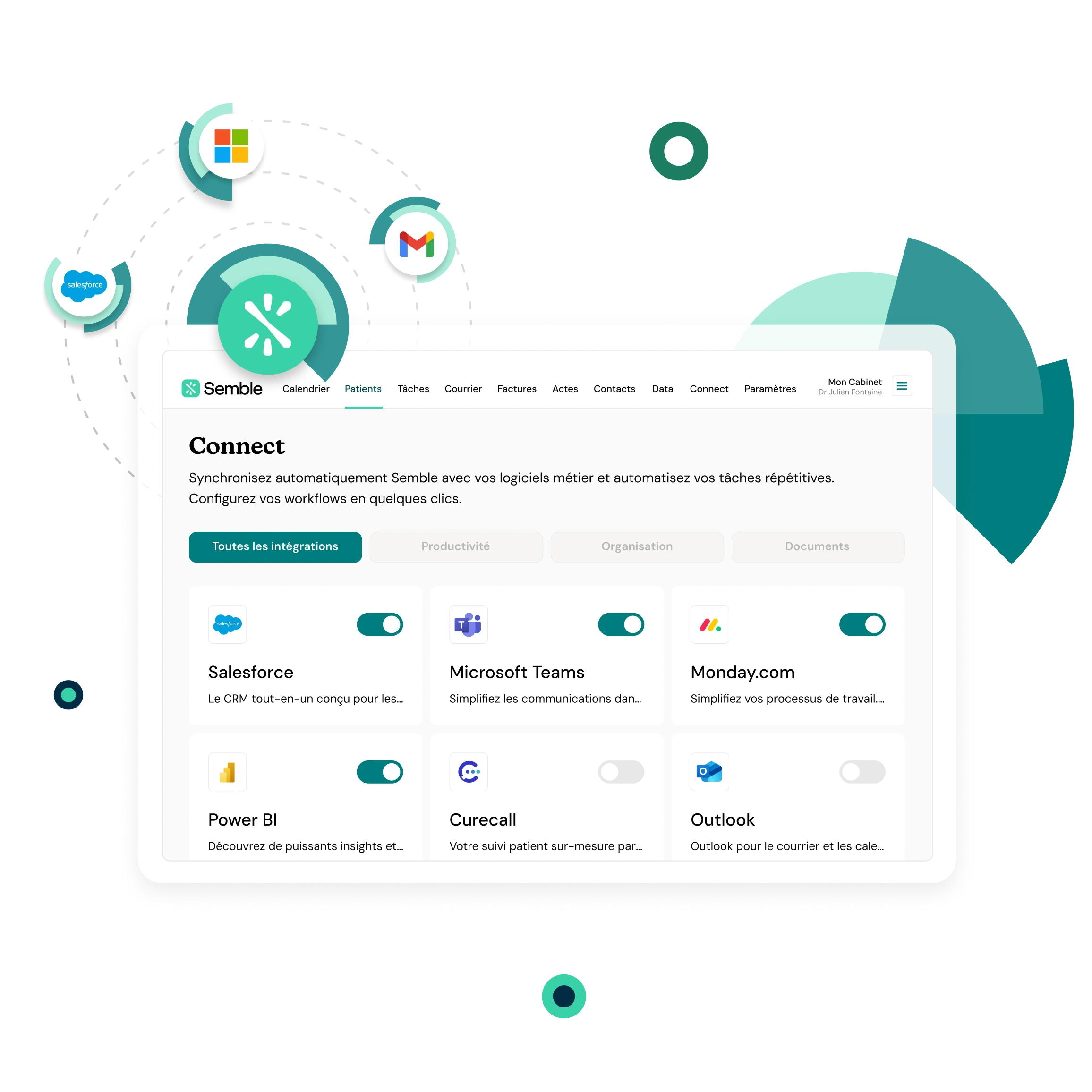 Connectez Semble à vos logiciels et outils métiers existants et créez des workflows automatisés sur mesure. De la comptabilité à la communication patient, en passant par la gestion RH : automatisez sans limites.