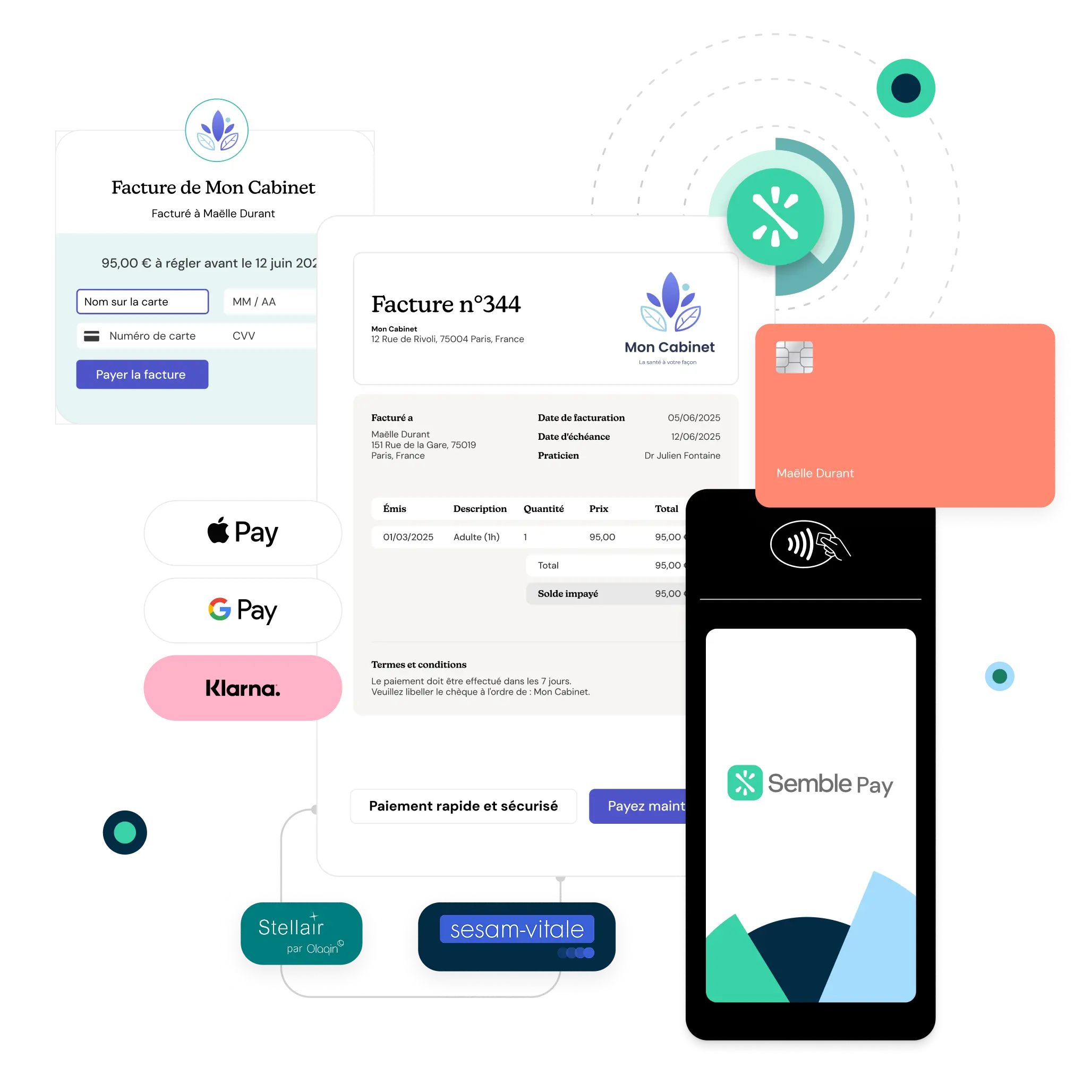 Génération et télétransmission automatique des feuilles de soins électroniques via notre intégration avec Stellair par Olaqin. Compatible SESAM-Vitale pour lecture de carte Vitale et gestion du tiers payant. Pour vos consultations secteur 2, hors convention ou avec dépassements d'honoraires, Semble Pay simplifie l'encaissement : acceptez les paiements en ligne, en cabinet ou via liens de paiement sécurisés (carte bancaire, Apple Pay, Google Pay).