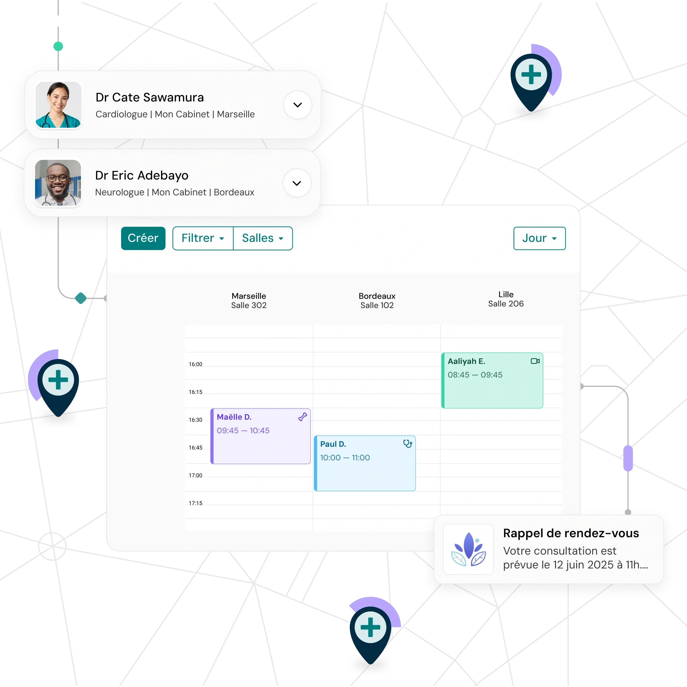 Gérez tous vos cabinets et types de consultation (urgences, suivis, téléconsultations) depuis une seule interface et prévenez les conflits de réservation.