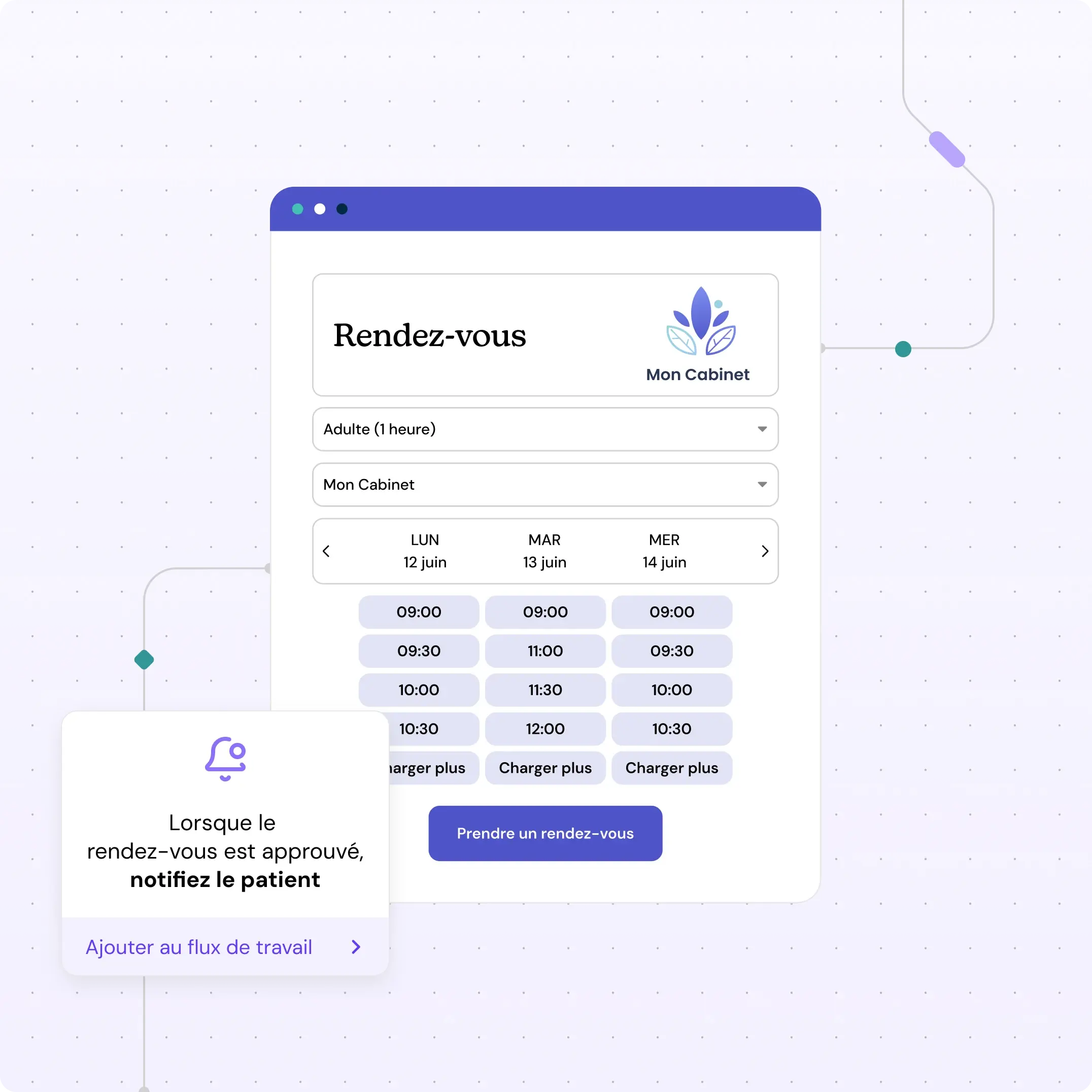 Oui, vous avez un contrôle total sur votre agenda. Bloquez des créneaux pour des tâches administratives, formations ou temps personnel. Créez des types de rendez-vous spécifiques pour les urgences avec des règles de réservation adaptées (délai court, priorité...).