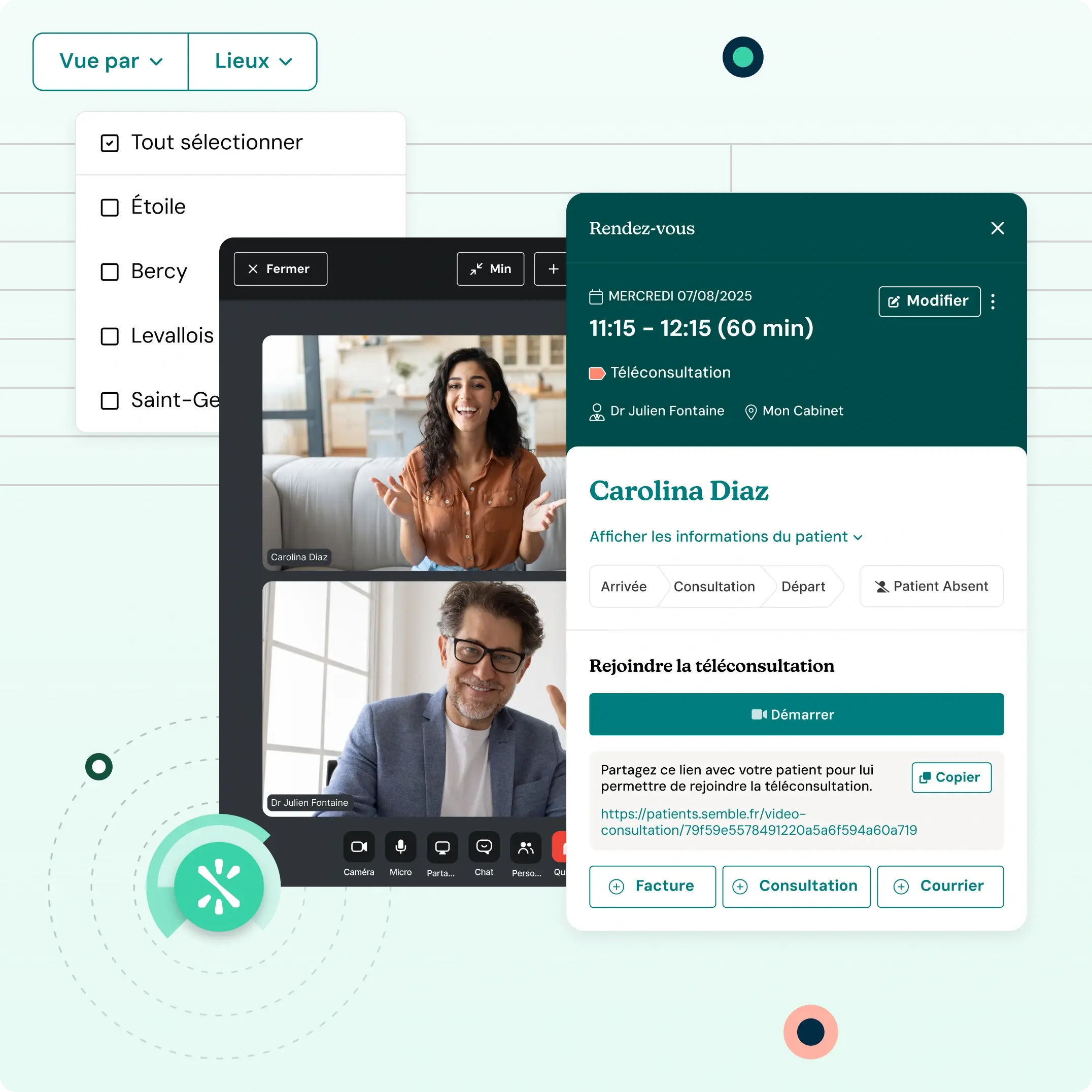 La téléconsultation est intégrée directement dans votre agenda. Un simple clic depuis votre planning lance la consultation vidéo sécurisée. Vous partagez un lien avec votre patient, aucune installation requise de leur côté. Tout se passe dans Semble : pas besoin de jongler entre plusieurs outils.