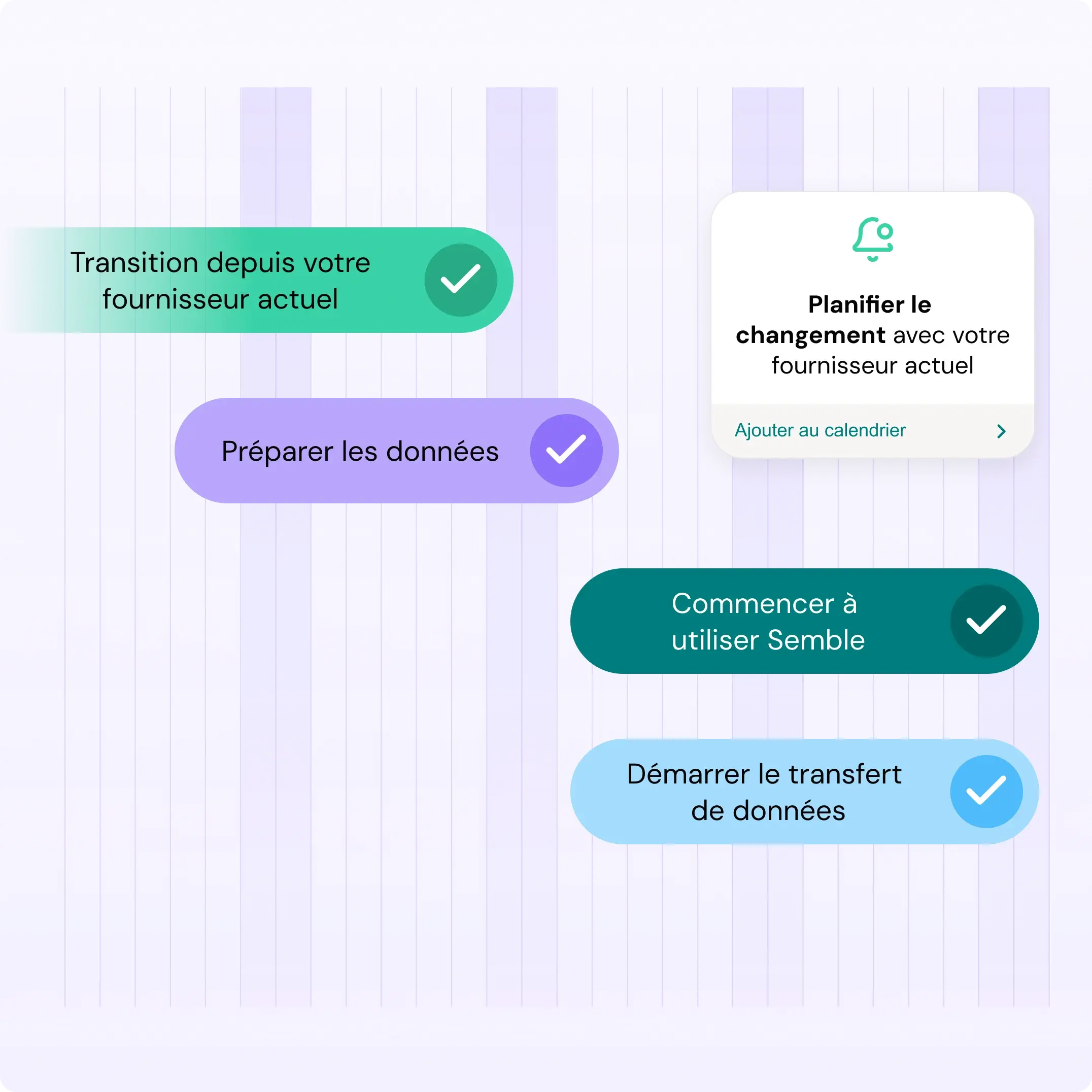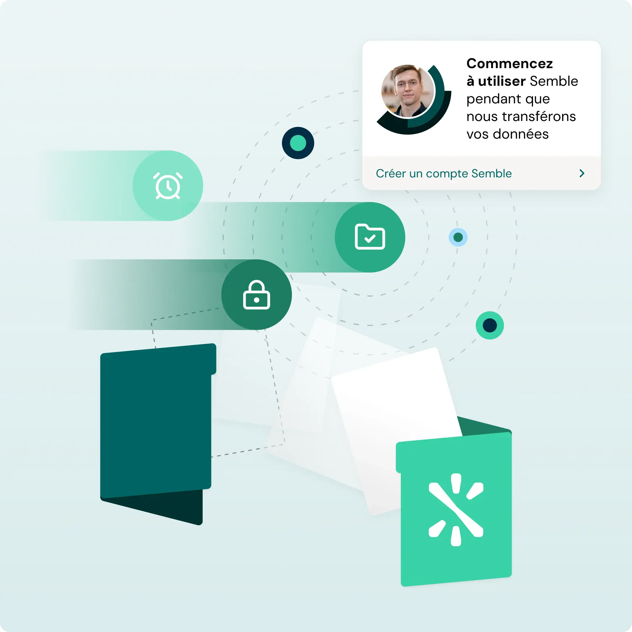 Libérez-vous de vos anciennes solutions sans temps mort. Commencez à utiliser Semble immédiatement pendant que nous transférons vos données en toute sécurité. En toute simplicité.