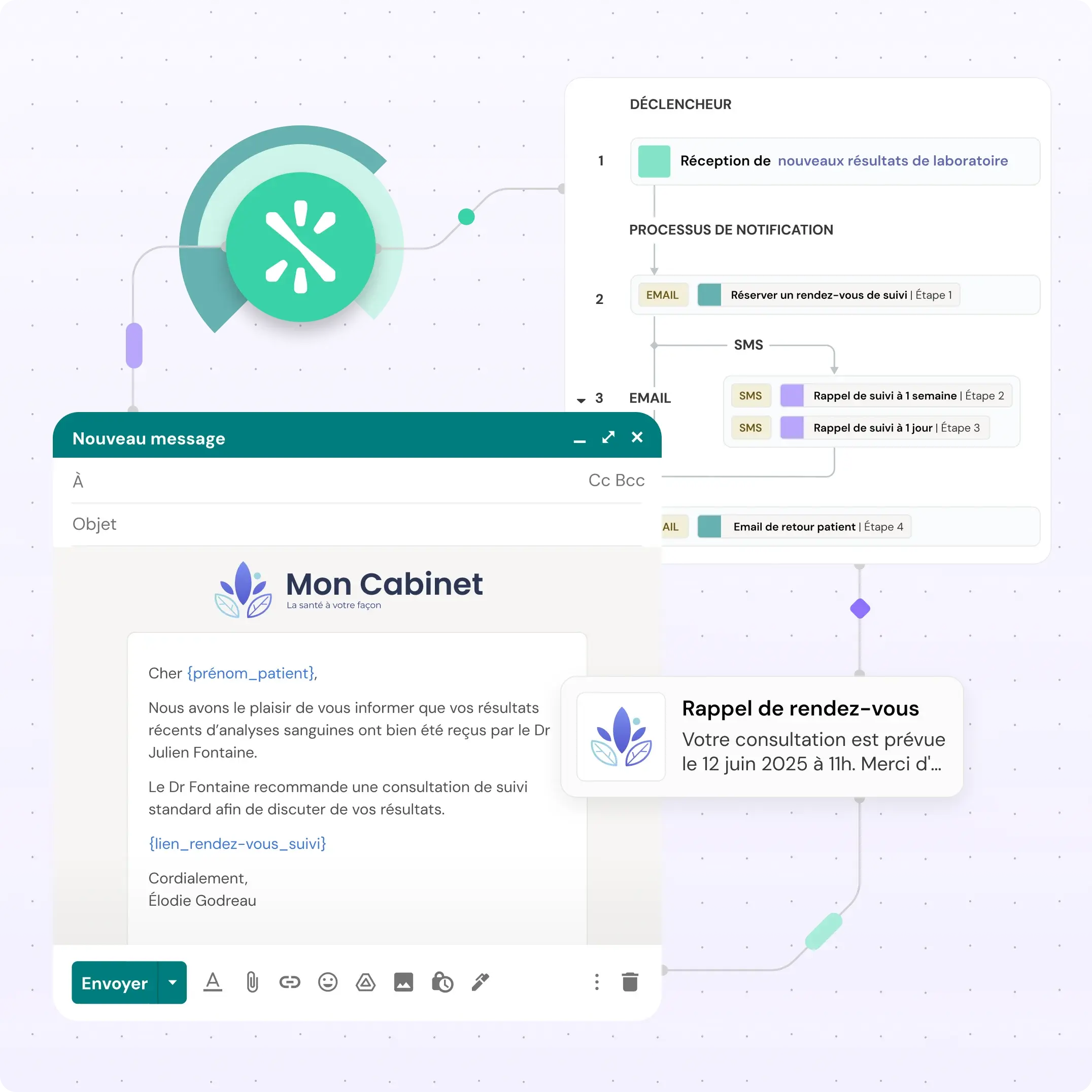 Une fois vos logiciels connectés, c’est vous qui décidez. Créez des automatisations puissantes pour des parcours de soins complexes en quelques heures seulement.