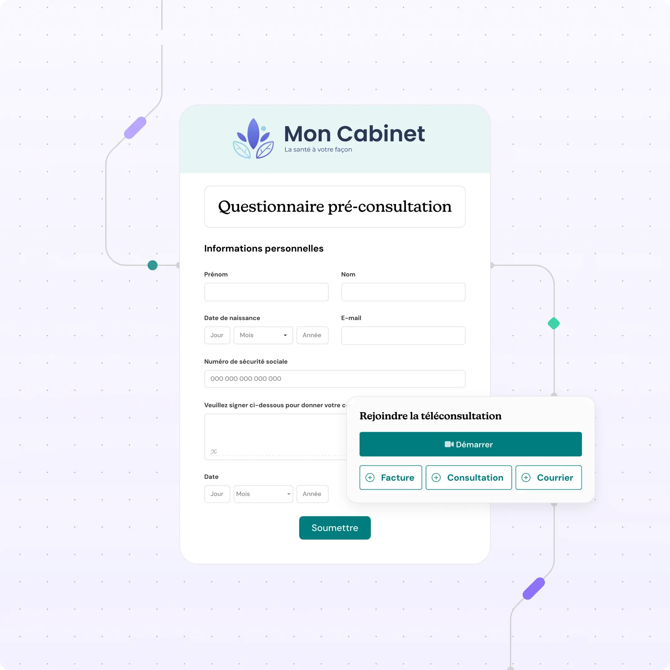 Consultez au même endroit les précédentes notes de consultation, l’historique médical et les résultats d’analyses. Trouvez les informations dont vous avez besoin plus rapidement. Profitez d’un appel vidéo moderne, avec réduction de bruit, floutage d’arrière-plan et salle d’attente virtuelle intégrés. Vos patients se connectent depuis n’importe quel appareil, sans téléchargement requis.