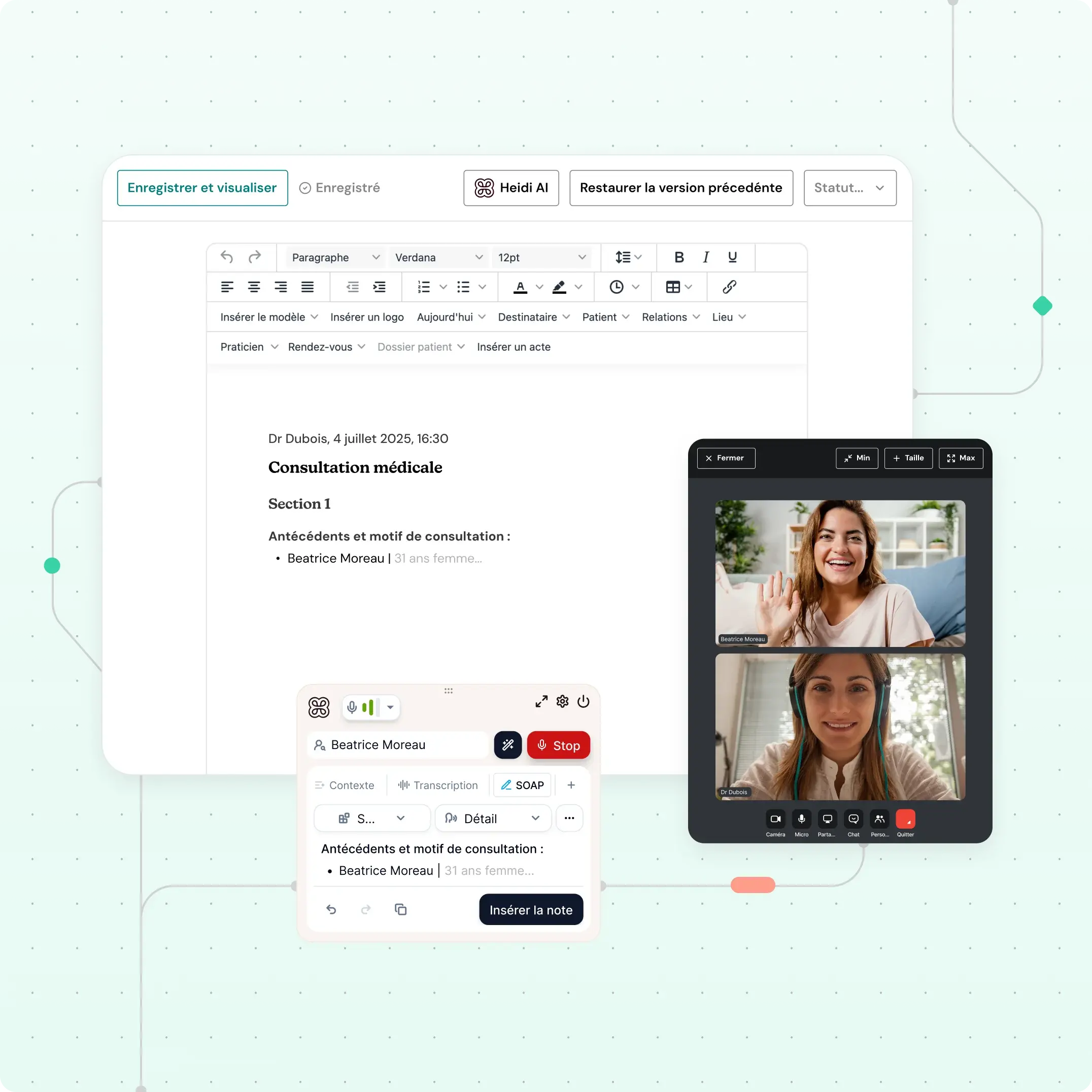 Plutôt que de jongler entre différents outils pendant vos téléconsultations, vous retrouvez tout le nécessaire en une seule interface. Les antécédents du patient chargent automatiquement, les ordonnances sont générées et l’IA s’occupe de tout documenter pendant que vous vous concentrez sur la conversation. Ce qui était une expérience frustrante et décousue devient un processus clinique fluide.