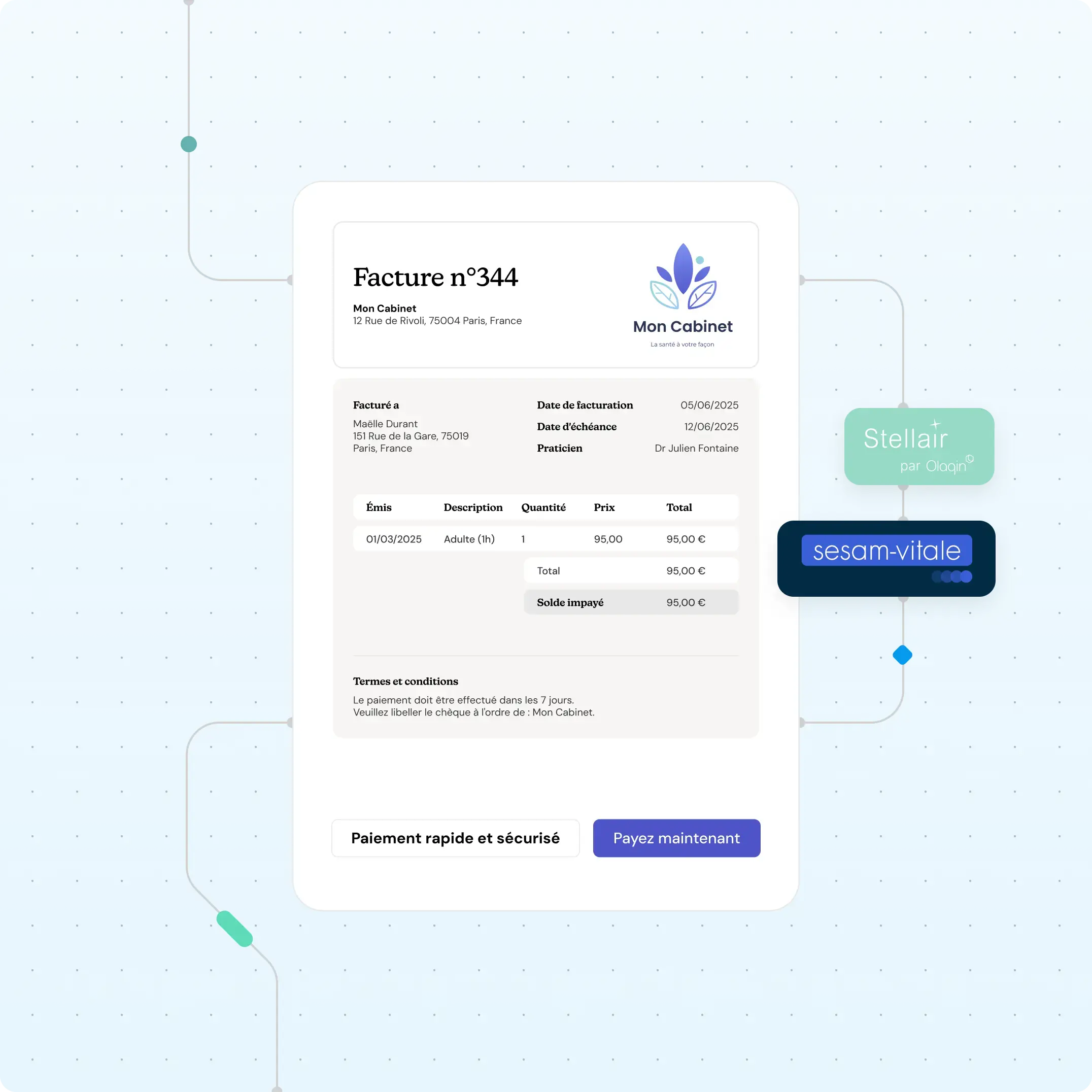 Soumettez vos feuilles de soins électroniques (FSE) en toute sécurité, directement depuis Semble. Rendue possible grâce à notre partenariat avec Olaqin, l’intégration de SESAM-Vitale à Semble assure un remboursement rapide, une conformité totale et de la tranquillité d’esprit, sans paperasse.
