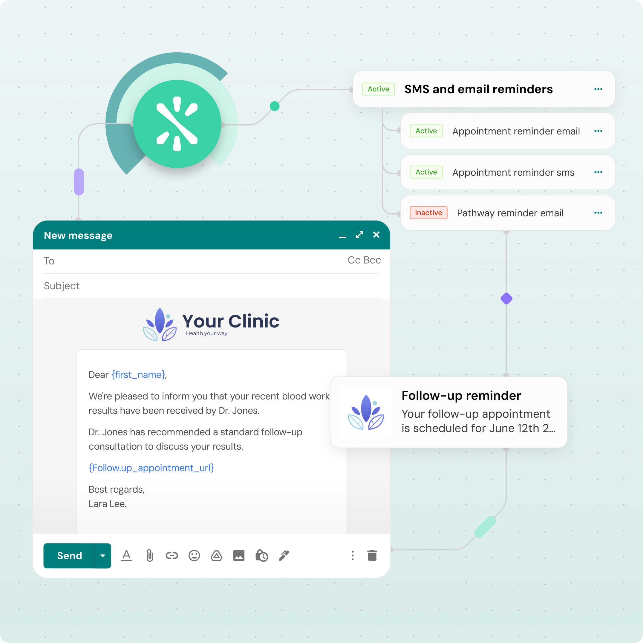 Send automatic reminders by email or SMS, so your patients know where to be and when. Tailor the timing and messaging by appointment type, reducing no-shows and eliminating the need for back-and-forth communication.