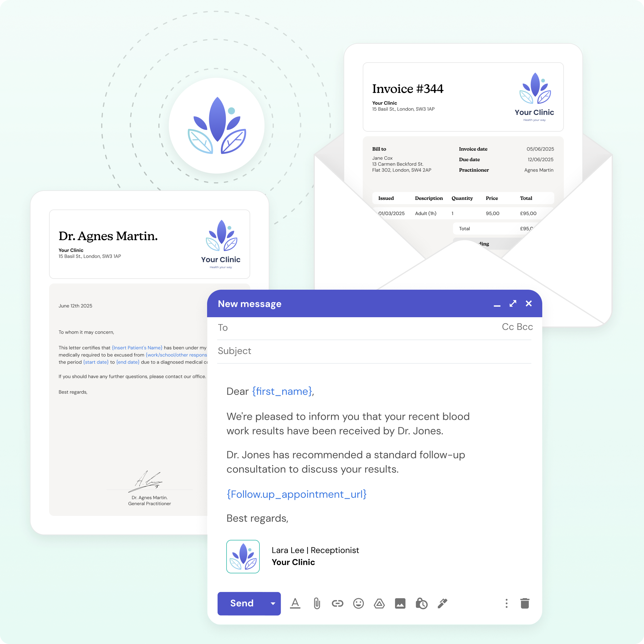 You can add your clinic name, logo and colours to emails, letters, invoices and the patient portal as part of OnBrand, a premium feature. All of your communications look like they’ve come directly from you and not a third party.