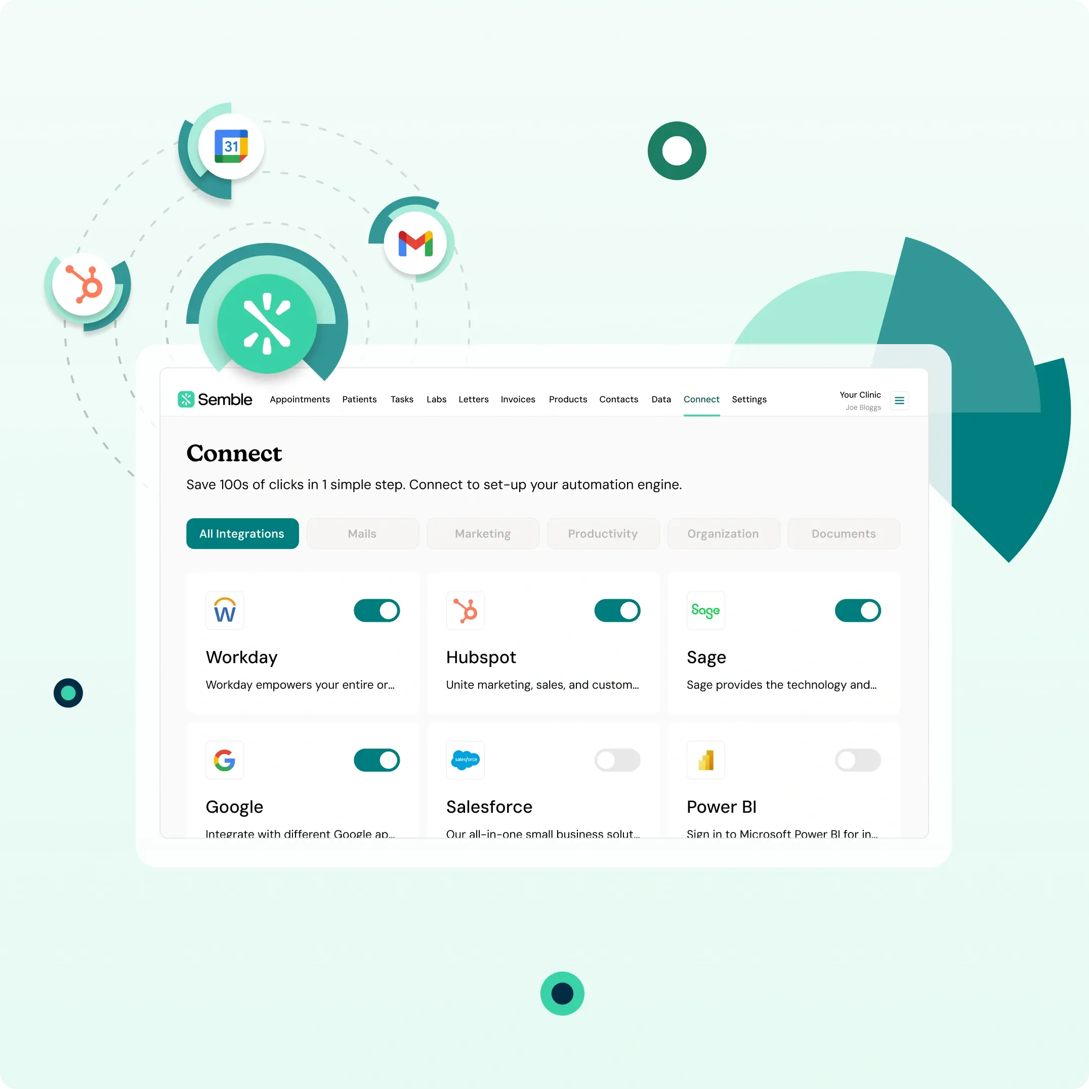 Most EHRs can only automate tasks inside their own system, like sending a reminder. Semble Connect is different. It lets you connect to over 1,200 external tools, like your calendar, CRM or finance system, and automate entire workflows across them, end-to-end.
